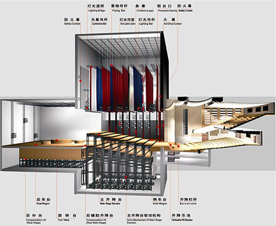 舞臺(tái)機(jī)械是為了保證最佳演出效果而采用的機(jī)械裝置。舞臺(tái)機(jī)械分為上部機(jī)械與舞臺(tái)下部機(jī)械。舞臺(tái)上部機(jī)械包括:音響反射板、防火幕、臺(tái)口幕、布幕吊桿、燈光吊桿、燈光吊籠、柱光架、舞臺(tái)口、吊點(diǎn)機(jī)、大幕拉幕機(jī)、電影寬銀幕等;下部機(jī)械包括:升降樂(lè)池、升降臺(tái)、滑臺(tái)、車(chē)臺(tái)、轉(zhuǎn)臺(tái)等。 舞臺(tái)機(jī)械系統(tǒng)是比較復(fù)雜、特殊的演藝機(jī)械設(shè)備。系統(tǒng)的可行性、可靠性和安全性是設(shè)計(jì)和施工過(guò)程中最重要環(huán)節(jié)。舞臺(tái)機(jī)械作為一種非常專(zhuān)業(yè)的領(lǐng)域,非常講究工藝設(shè)計(jì)和技術(shù)要求,以確保設(shè)備功能的完美和使用的安全、可靠。建筑設(shè)計(jì)必須為舞臺(tái)設(shè)計(jì)提供足夠的空間尺度,滿(mǎn)足臺(tái)上機(jī)械布置。同時(shí),在設(shè)計(jì)時(shí)應(yīng)考慮舞臺(tái)機(jī)械設(shè)備荷載、預(yù)埋件、用電負(fù)荷等要求。舞臺(tái)機(jī)械設(shè)計(jì)不僅要滿(mǎn)足舞美及舞臺(tái)其它設(shè)備的布置要求,而且還要滿(mǎn)足所有舞臺(tái)設(shè)備的安裝、檢修、操作等使用要求。舞臺(tái)機(jī)械系統(tǒng)在工藝設(shè)計(jì)、設(shè)備制造、安裝過(guò)程中嚴(yán)格按照行業(yè)設(shè)計(jì)規(guī)范,可靠性標(biāo)淮,系統(tǒng)部分關(guān)鍵部位甚至高于標(biāo)準(zhǔn)要求,使設(shè)備有長(zhǎng)期穩(wěn)定的工作能力,確保全套系統(tǒng)安全、可靠。